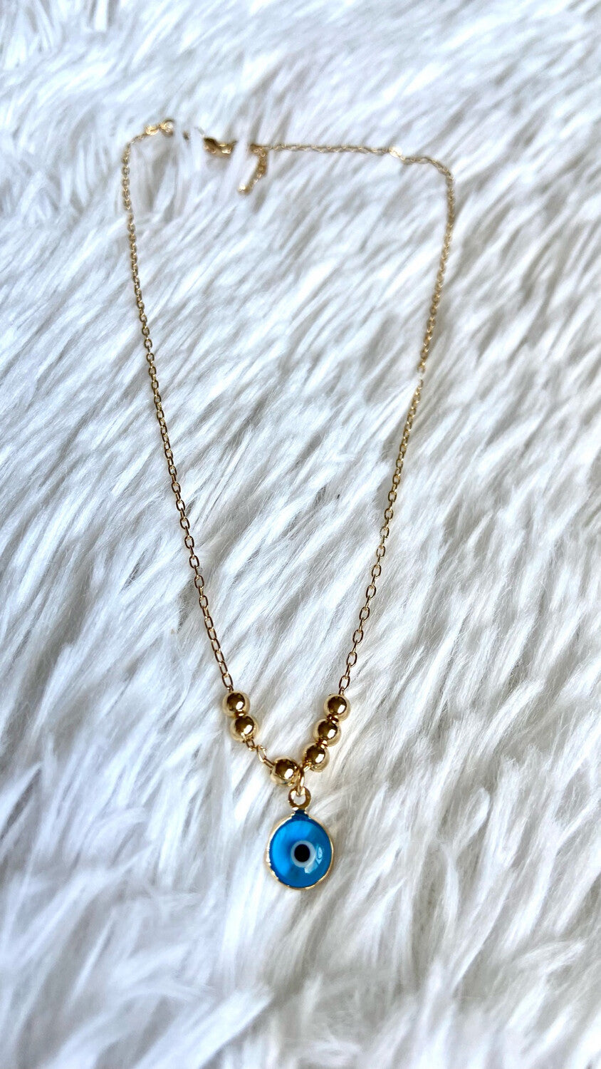 Gold filled dainty chain link necklace, accented with a dangling enamel eye and six beads - the beads can slide throughout the chain. Not recommended to wear while in the swimming pool.