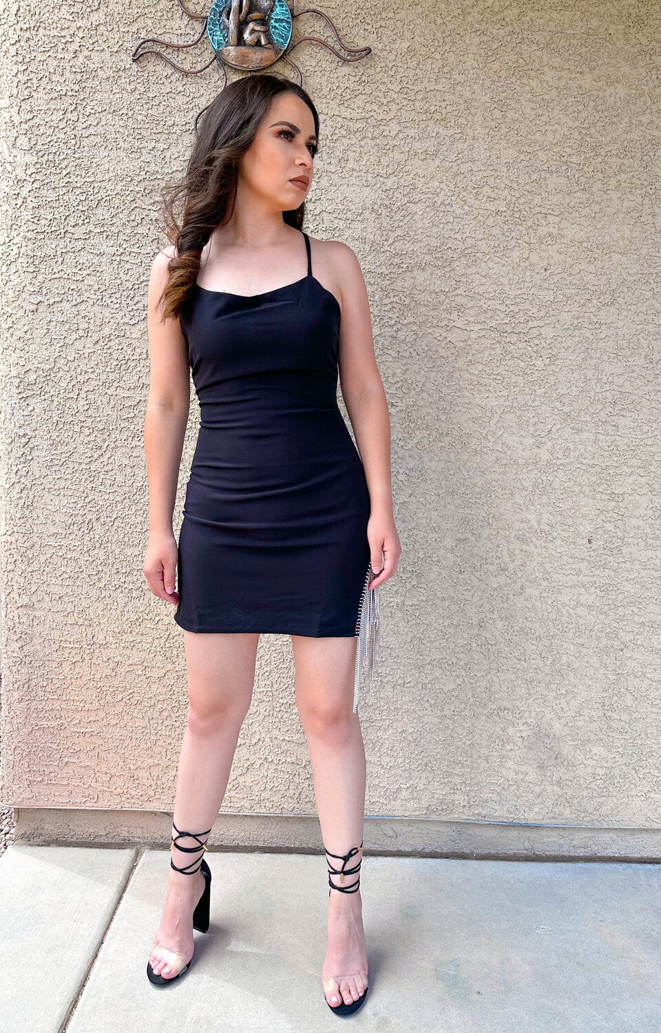 Square Neckline, Adjustable spaghetti straps, Crossed back detail, Double layered mini length, Rhinestone Fring