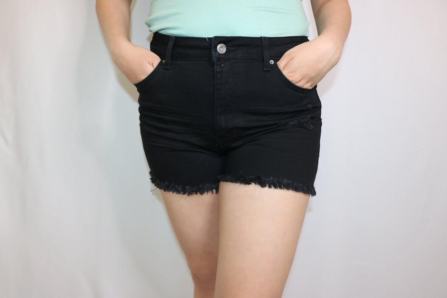 High-Waisted Shorts With Destruction And Frayed Hem. Traditional 5-Pocket With Zip Fly And One Button Closure