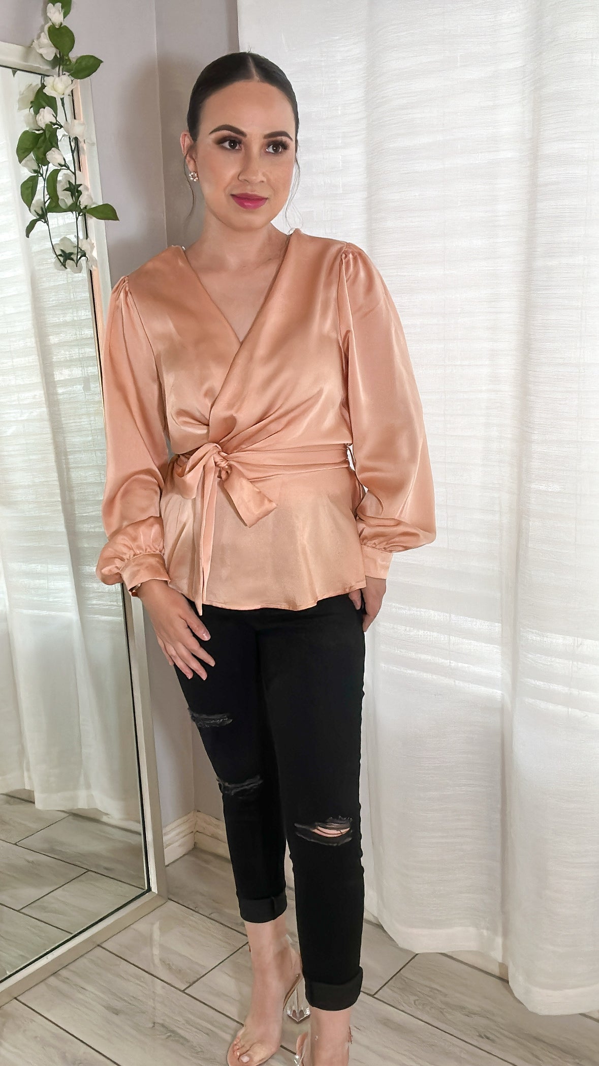 A satin wrap top, with a vogue trendy design, features long cuffed sleeves, a surplice neckline, a sash belt, waist-length, and a peplum hem.
