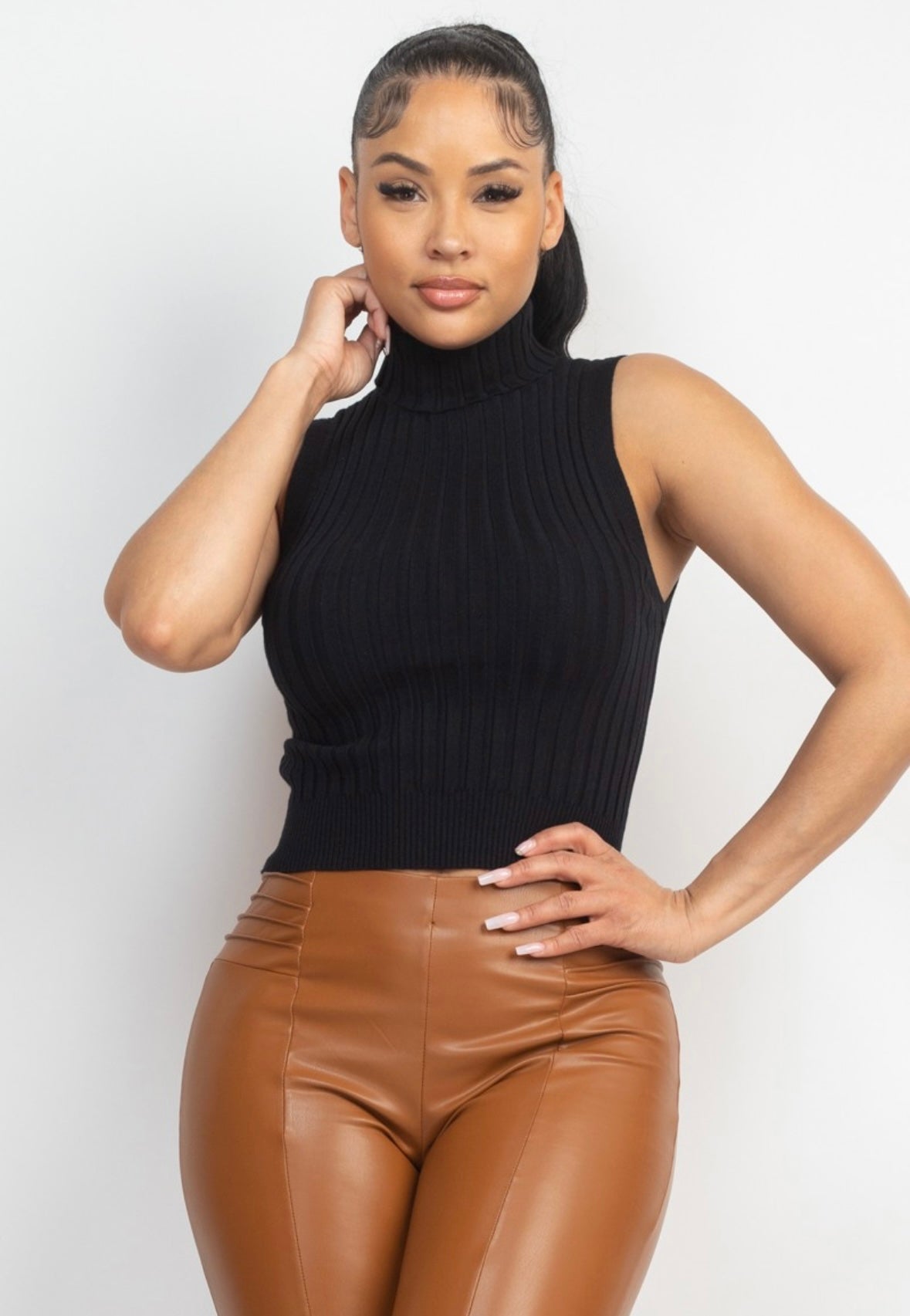 A ribbed sweater top in a solid color featuring a turtle neckline, sleeveless, elastic, and waist length.