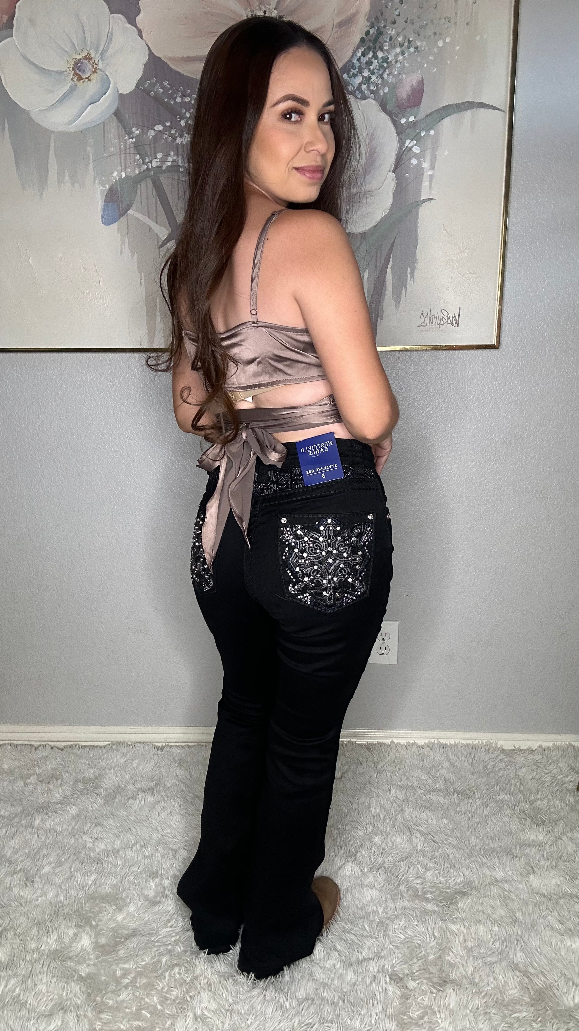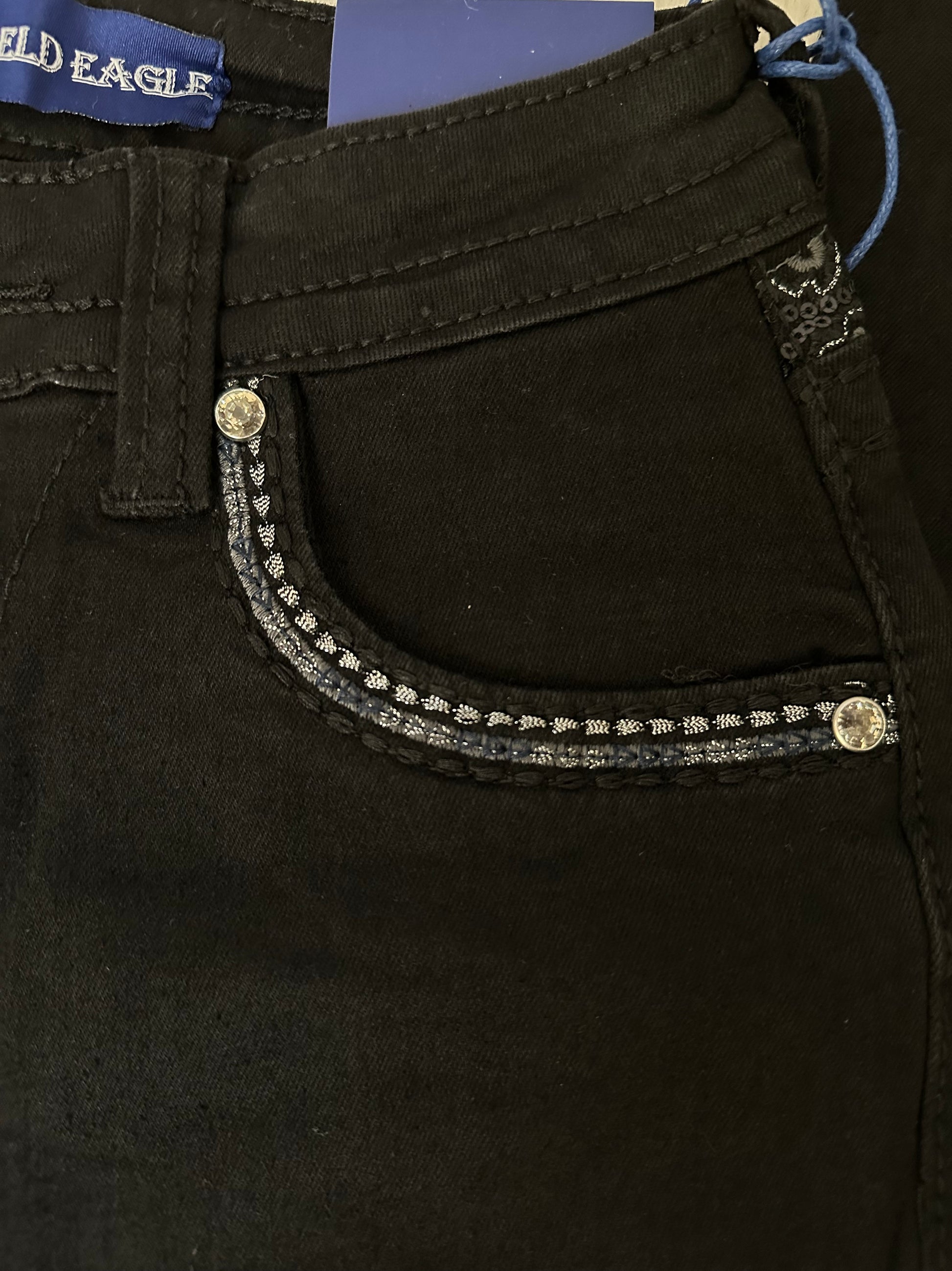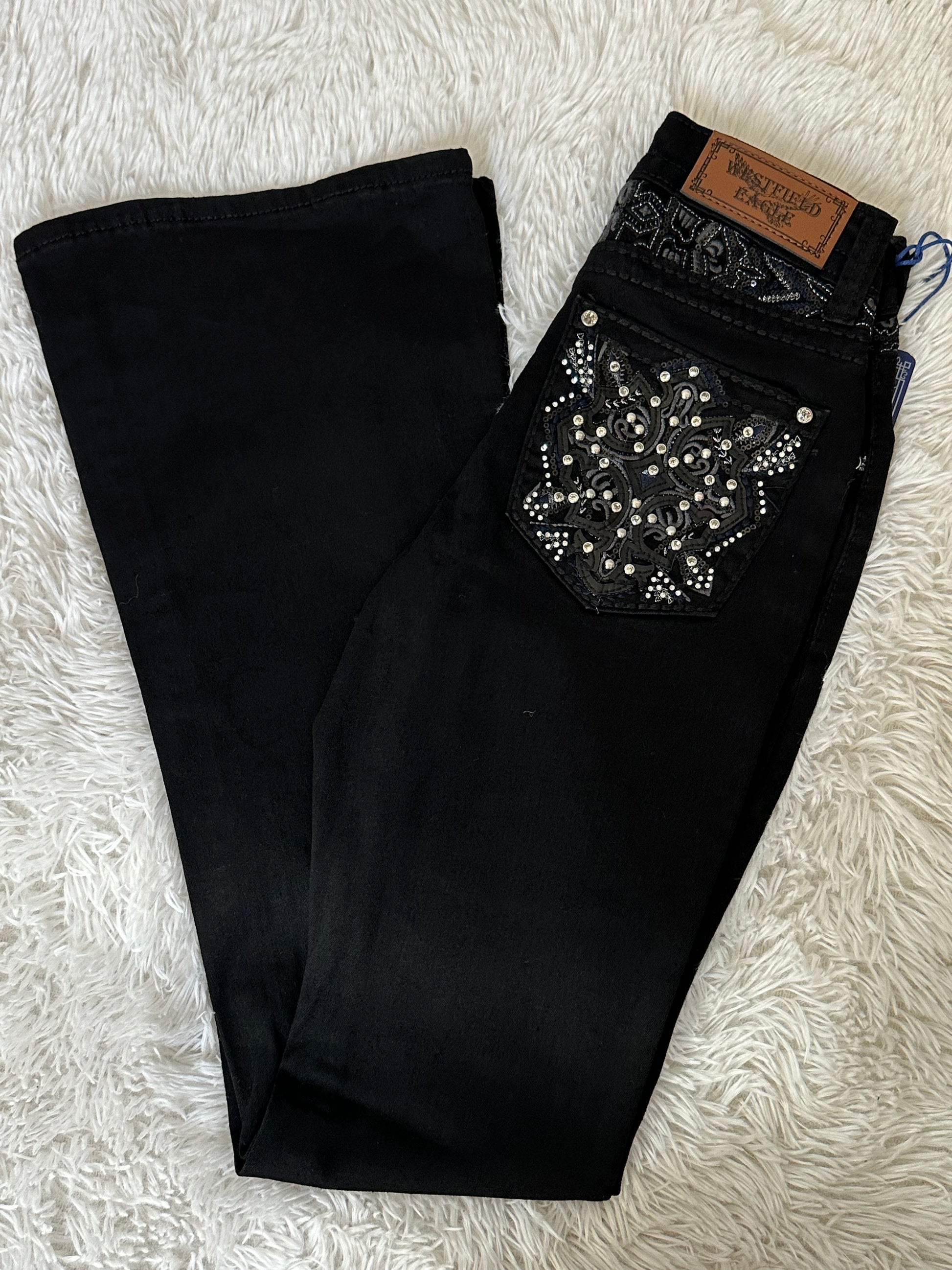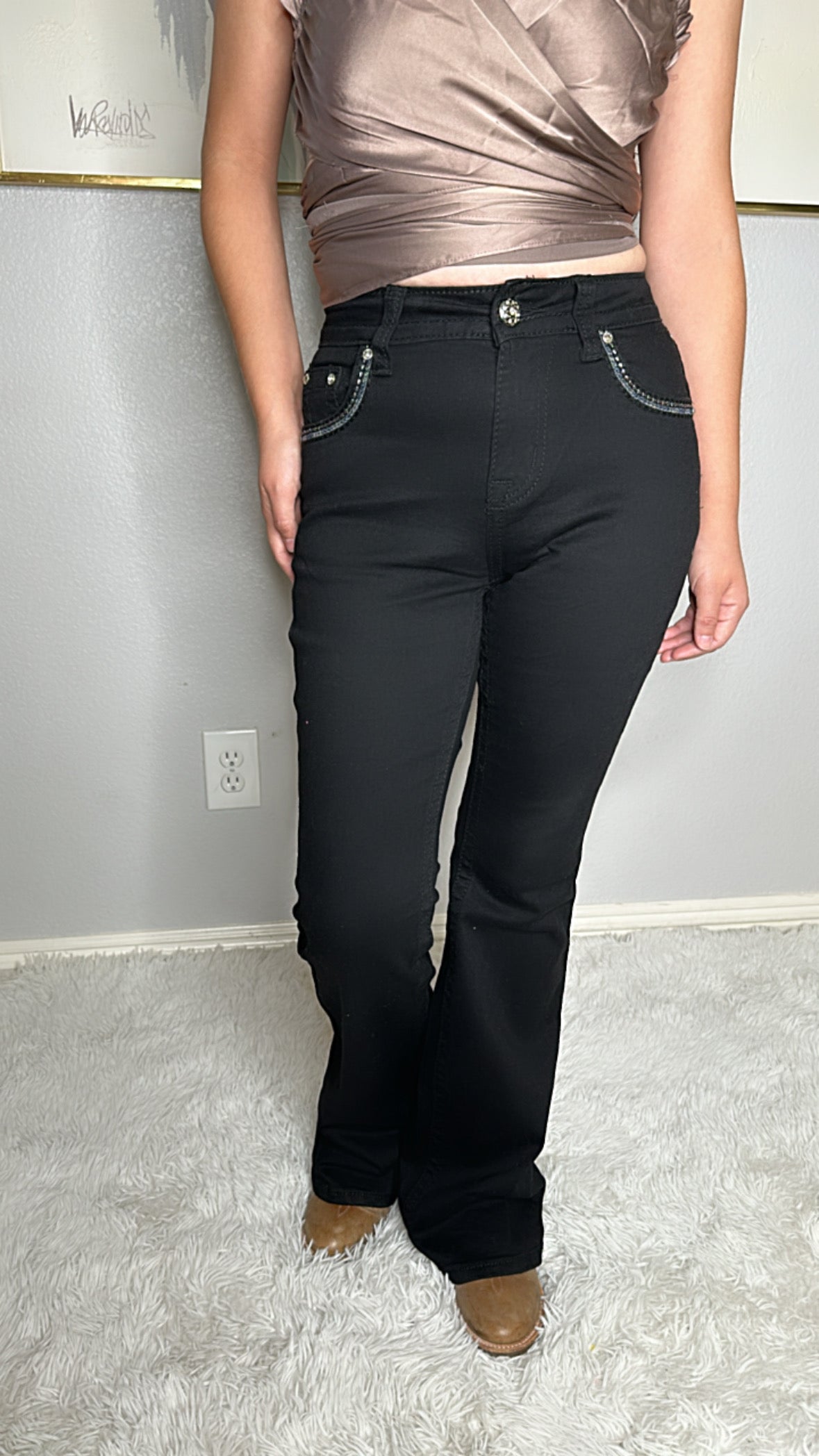 Hight Waisted Flare Jeans With Stretch Fit. Slim Through The Hip And Thigh . Jewel Button/ Zip Fly With Belt Loops And Rhinestone Rivets.