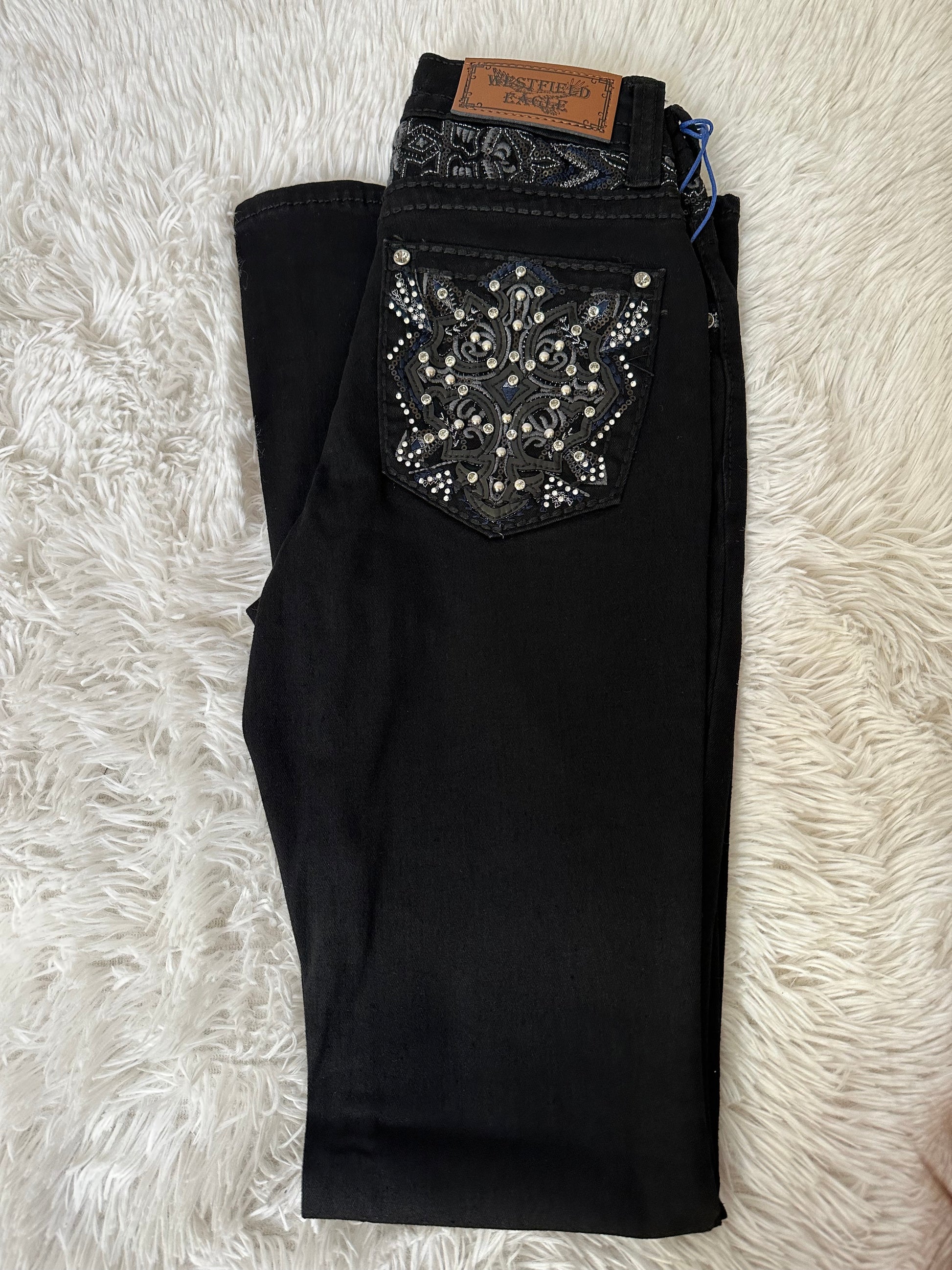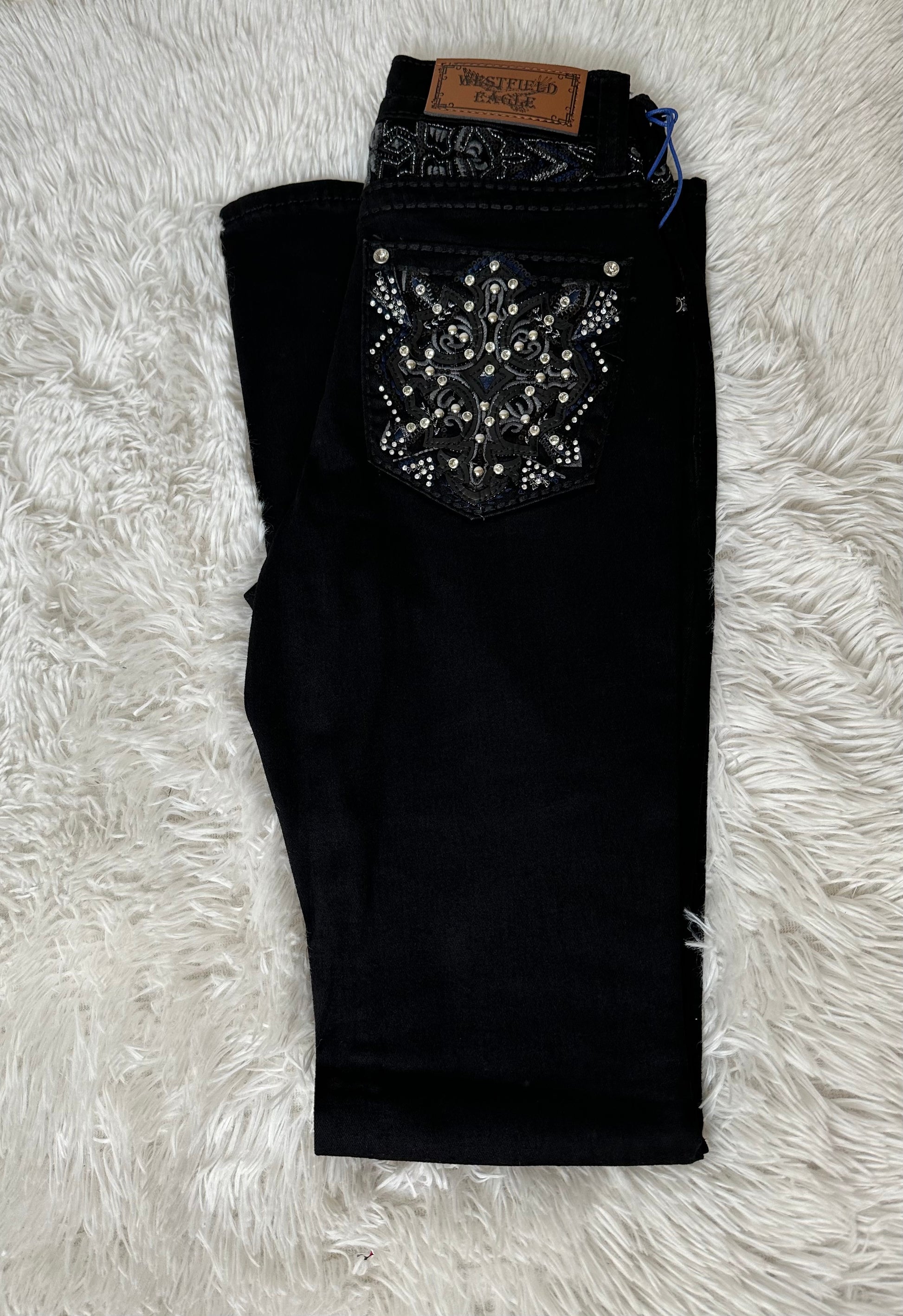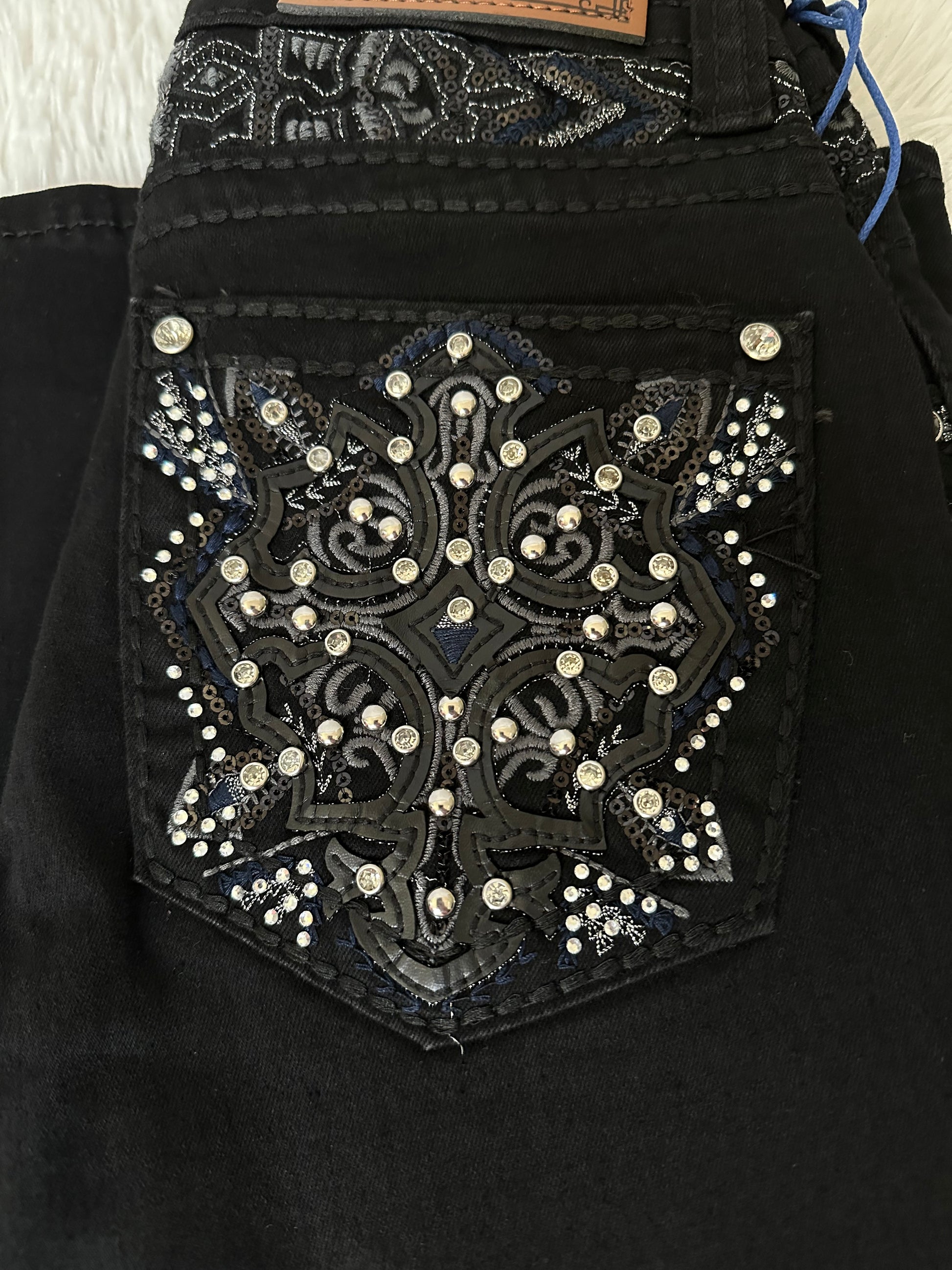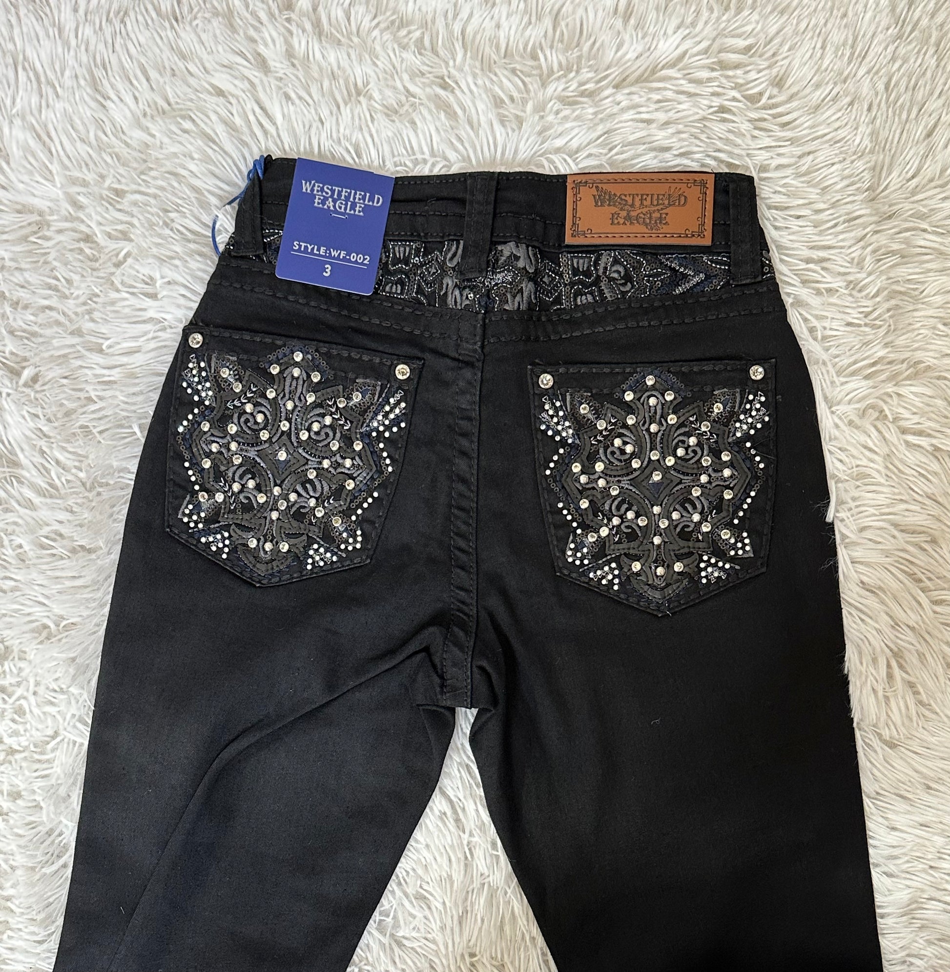 Hight Waisted Flare Jeans With Stretch Fit. Slim Through The Hip And Thigh . Jewel Button/ Zip Fly With Belt Loops And Rhinestone Rivets.