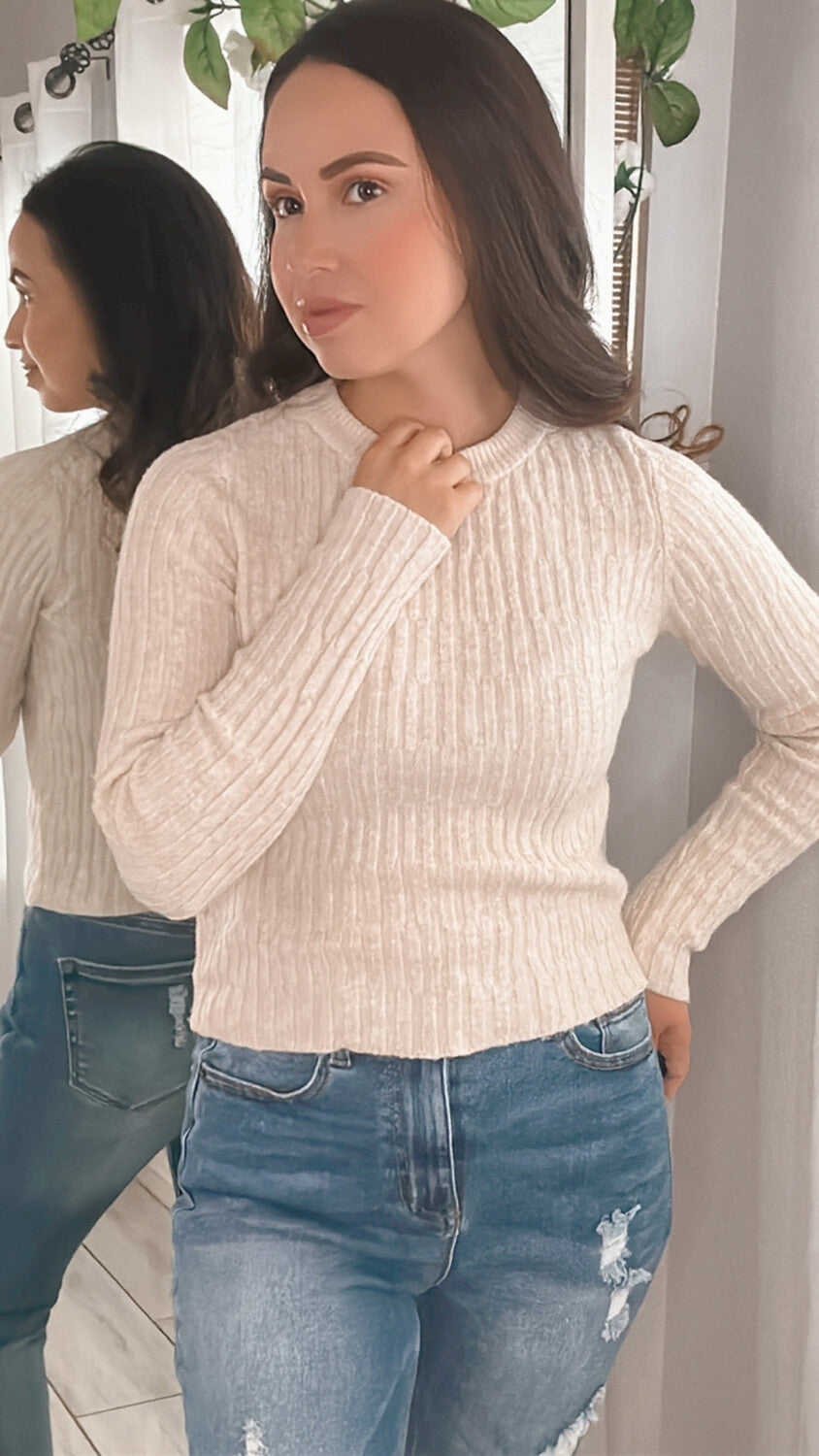 A ribbed knit sweater top featuring a round neckline, long sleeves, elastic material, and a waist length.