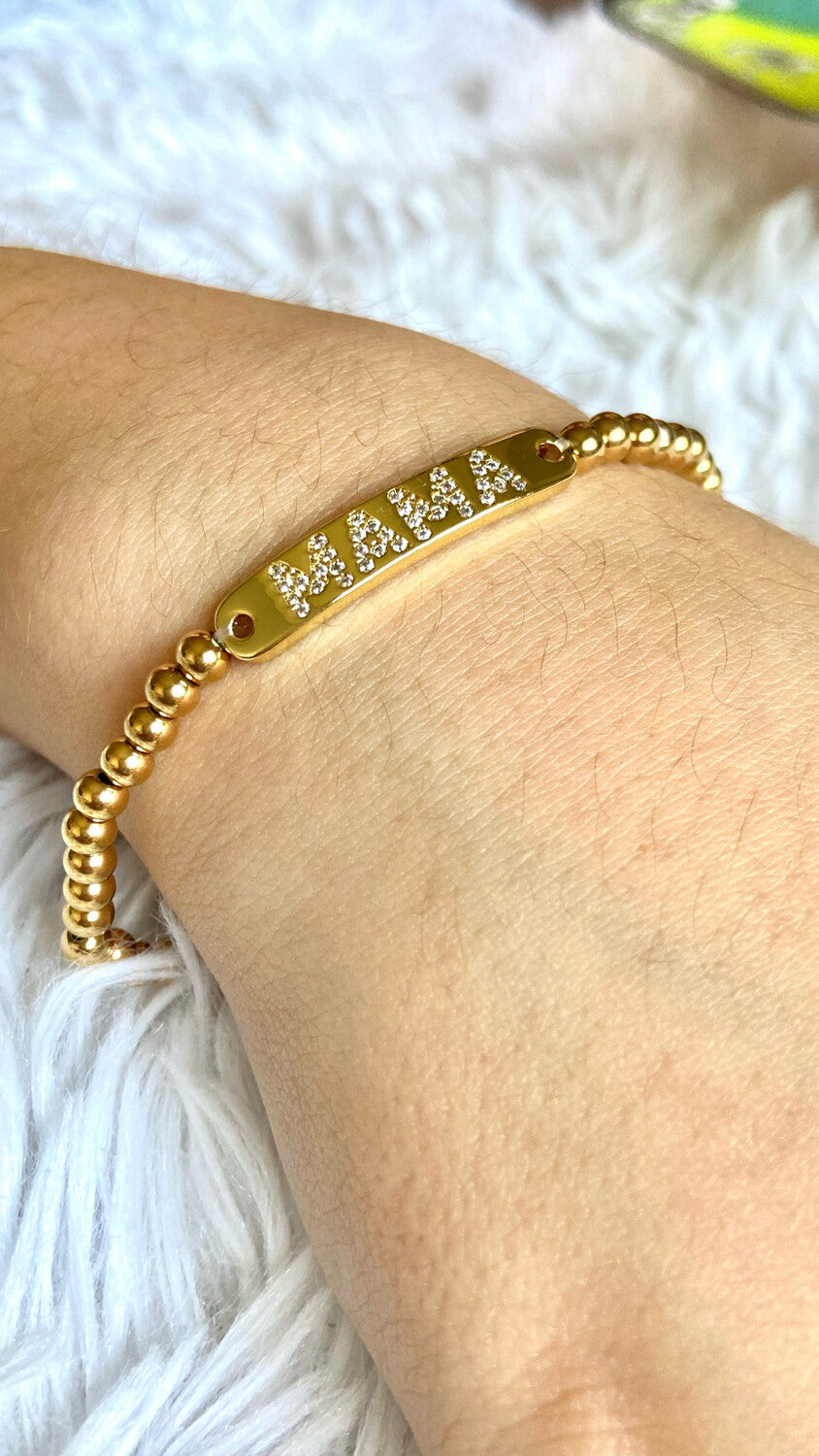 Beaded stainless steel stretch bracelet with cubic zirconia 'MAMA' on bar.