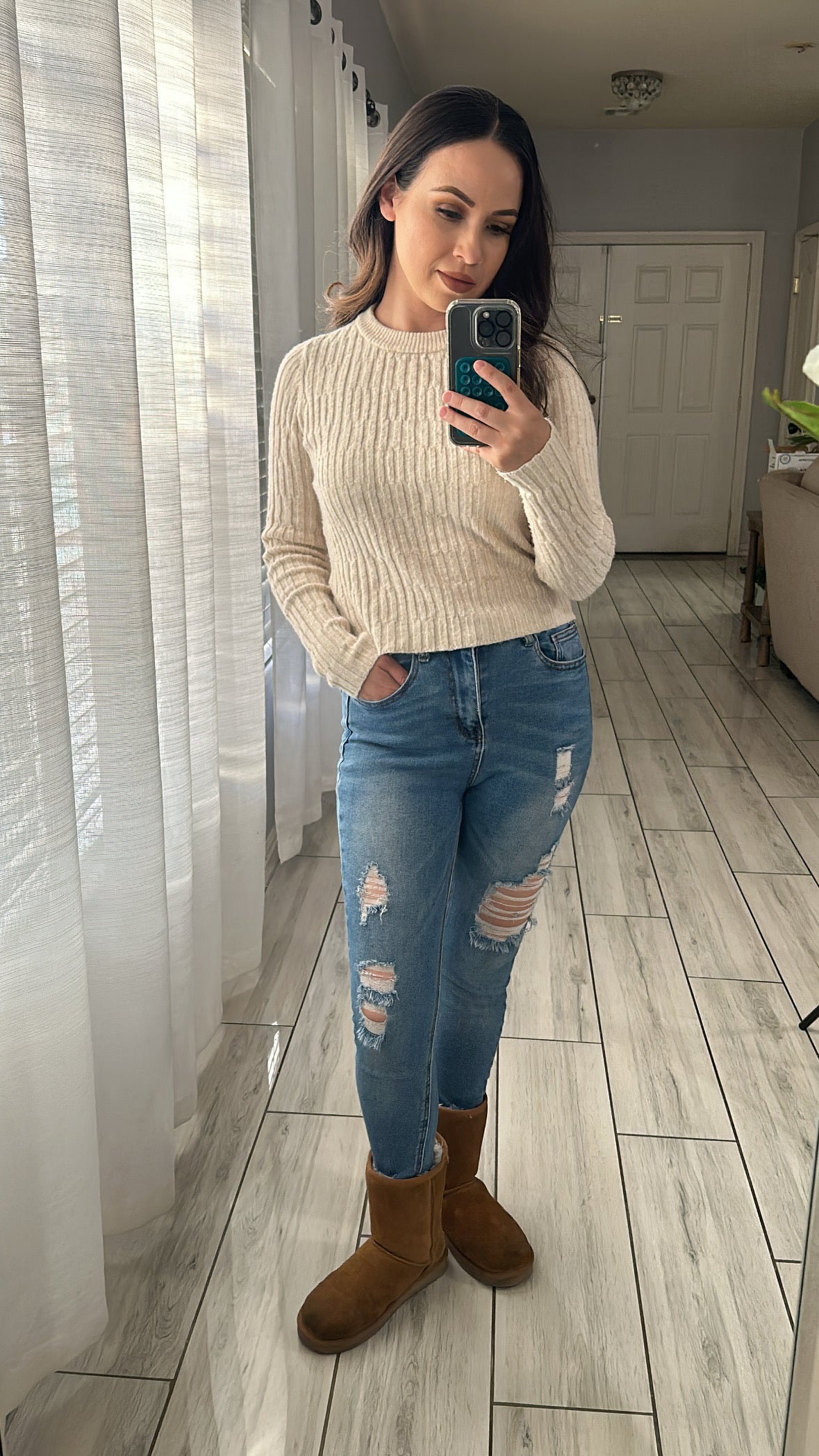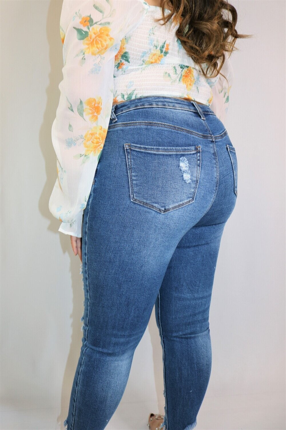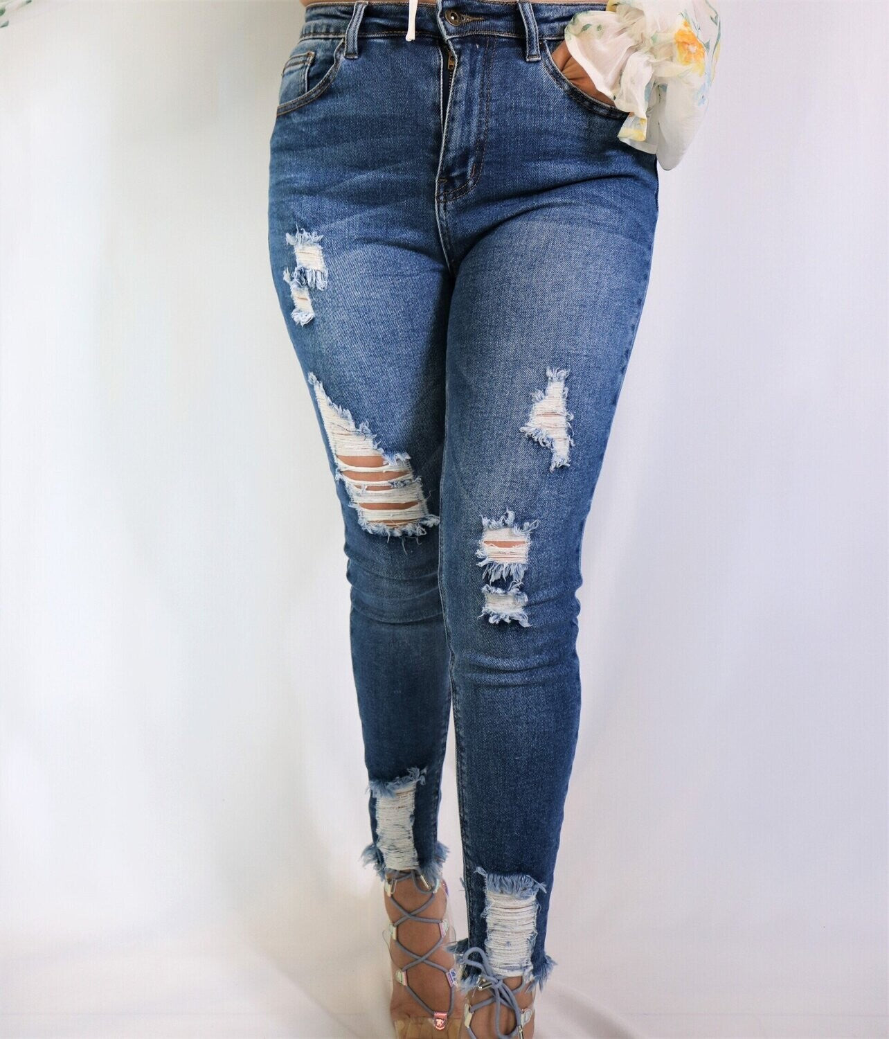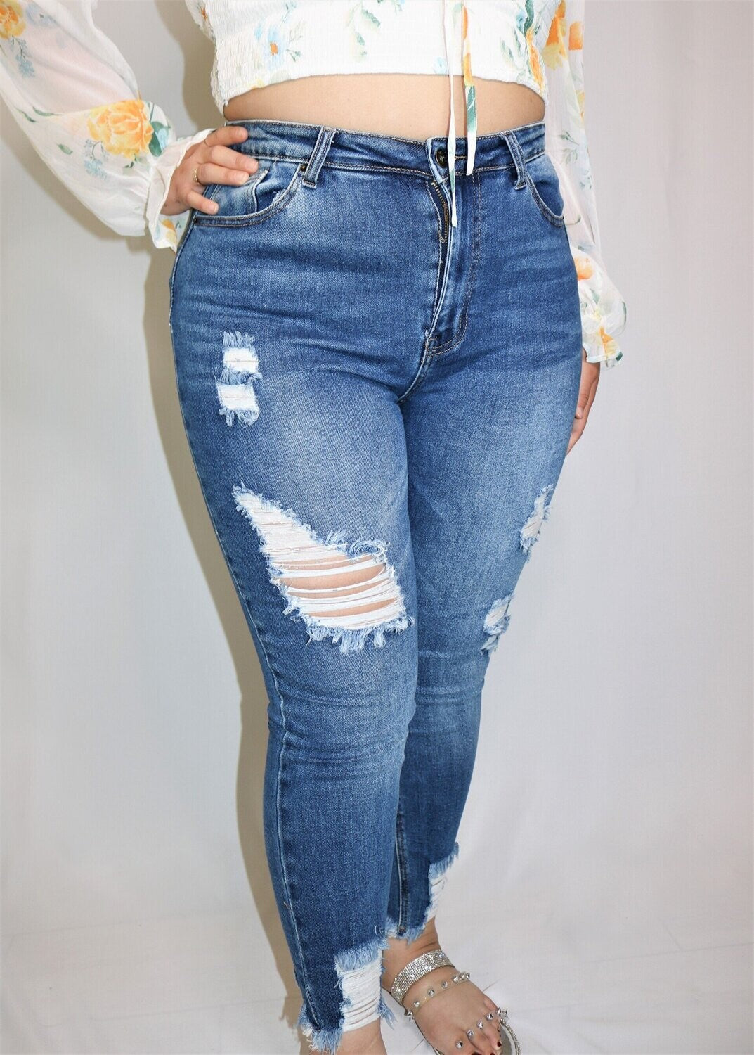 High-Rise ankle skinny in cotton rich stretch denim fabric. Classic 5 pocket construction with destructed hem and vintage inspired wash.