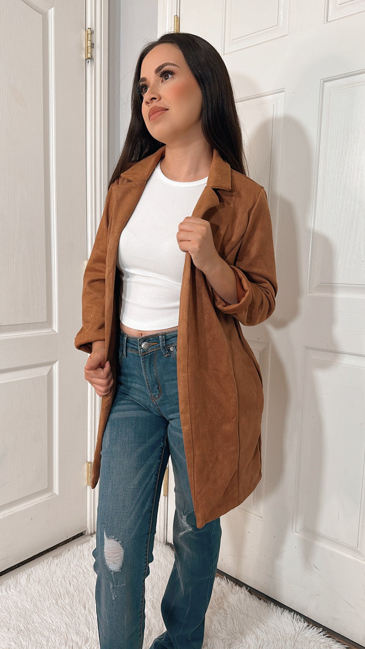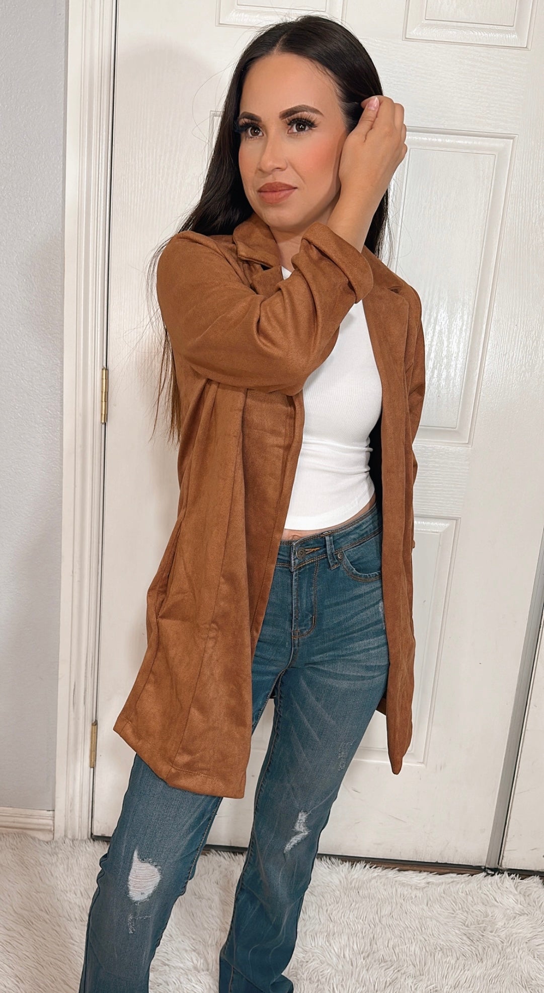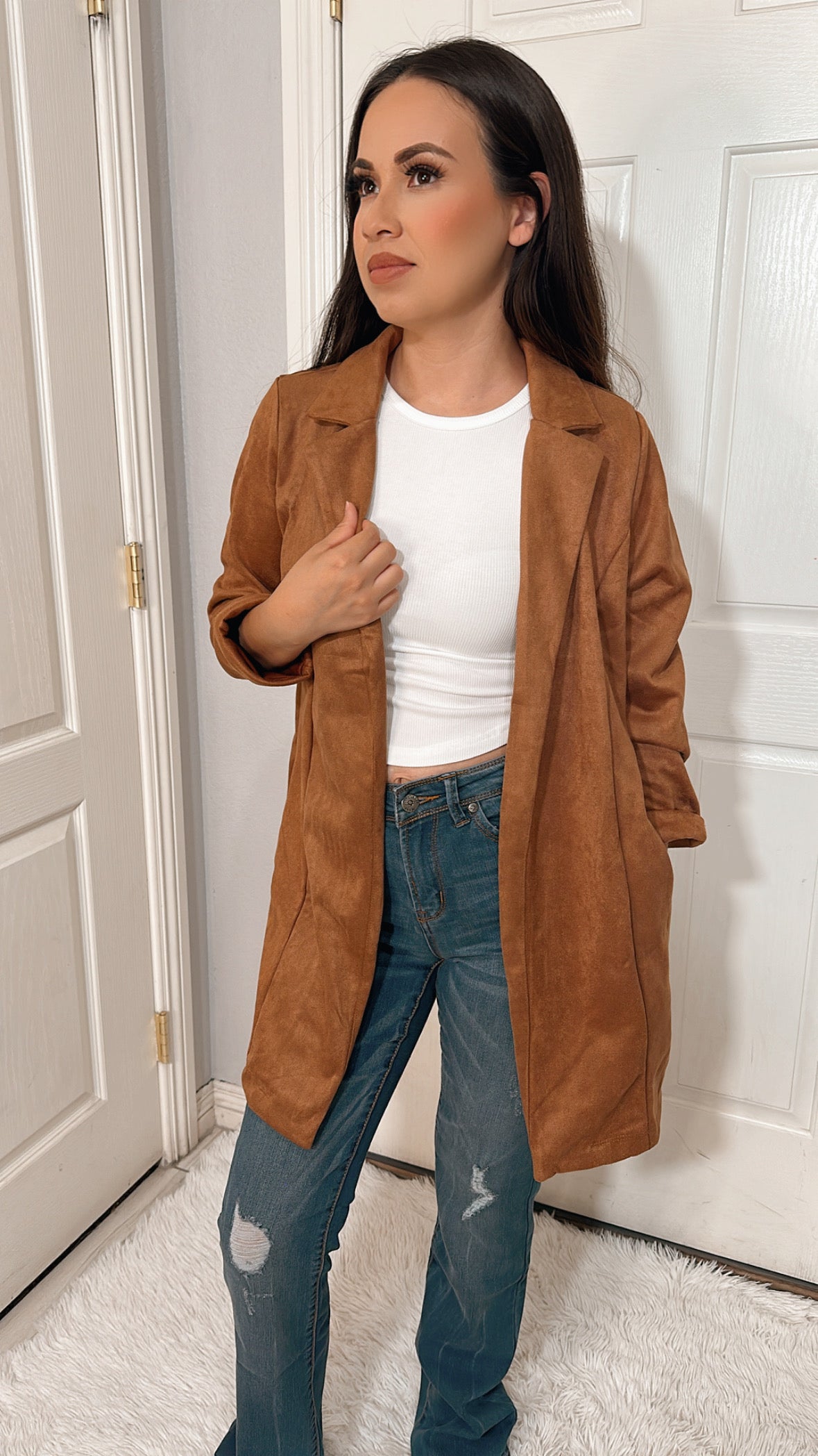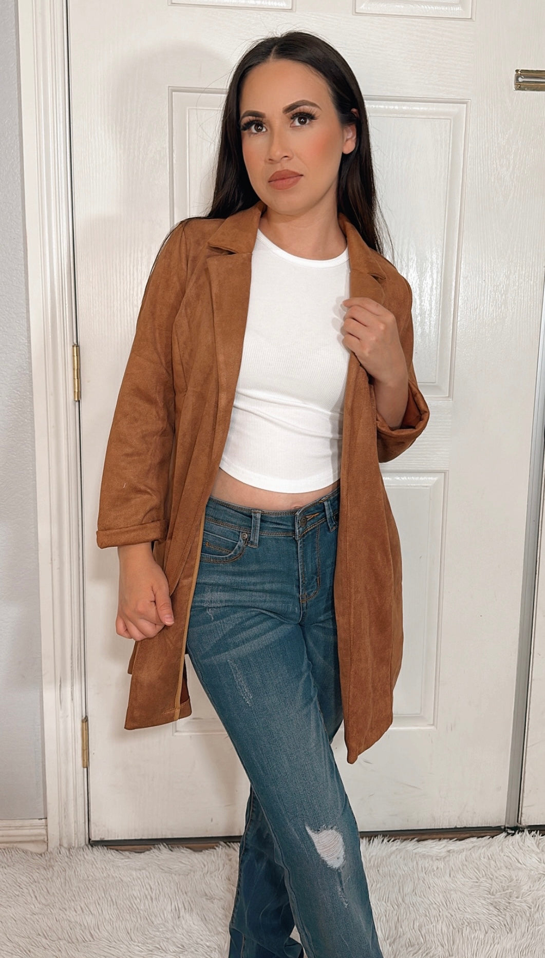 A woven suede blazer jacket in solid color featuring a notch collar, open-front design, and 3/4 rolled-up sleeves.