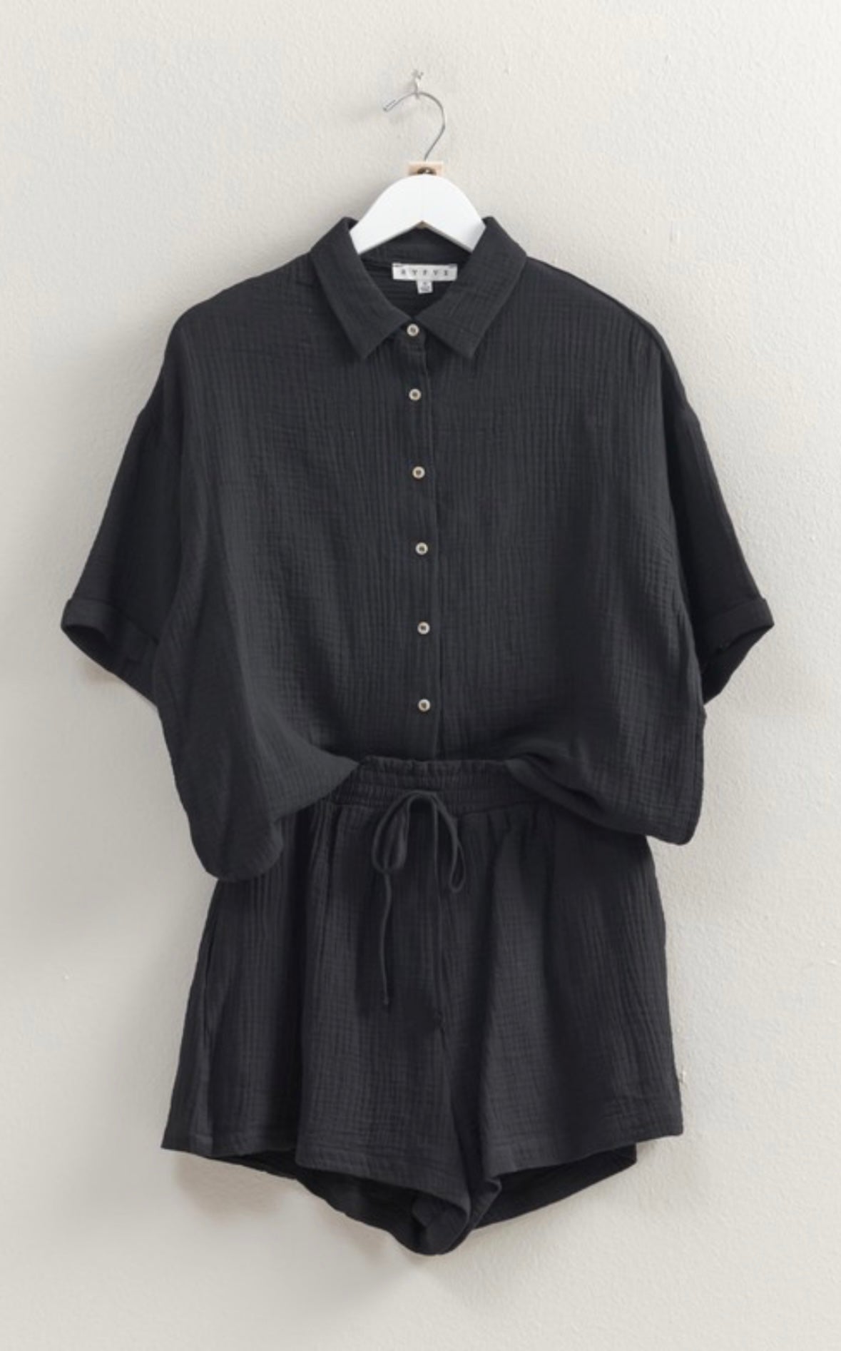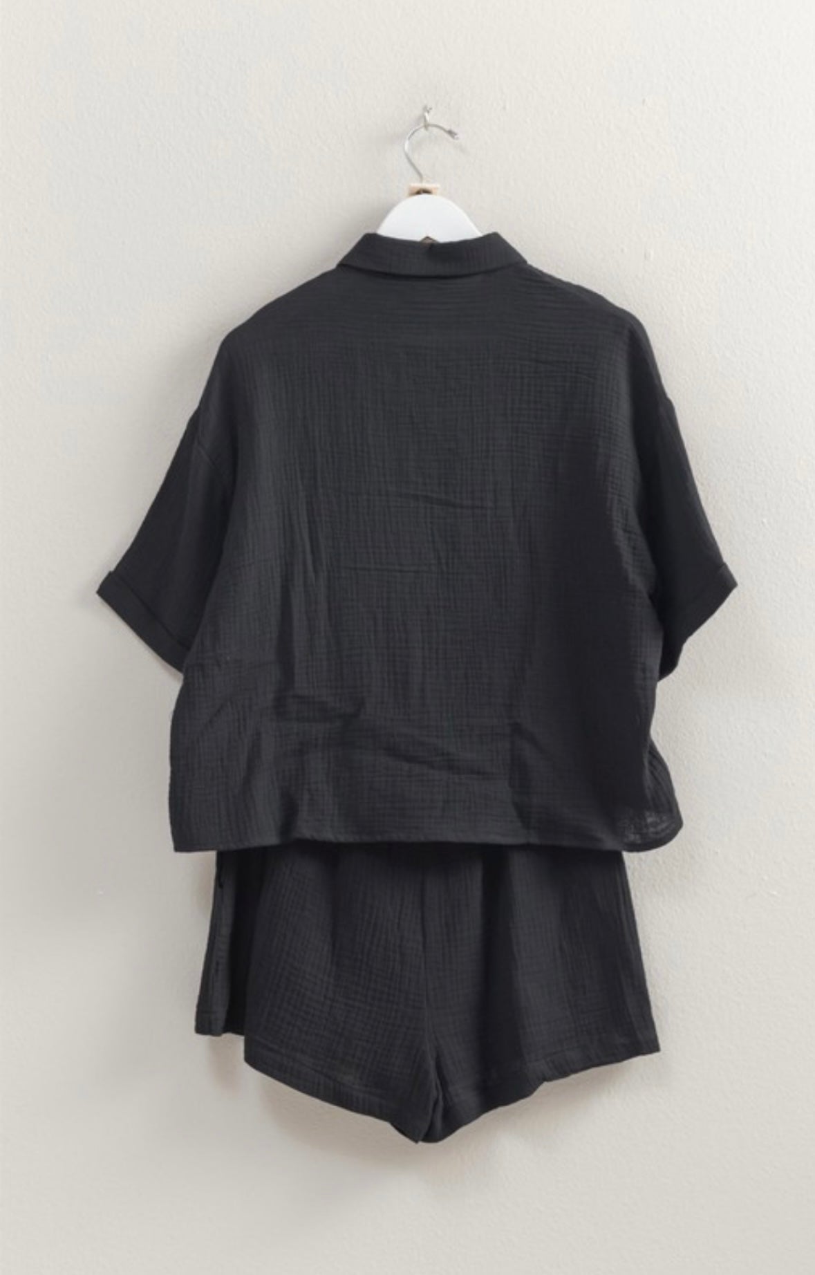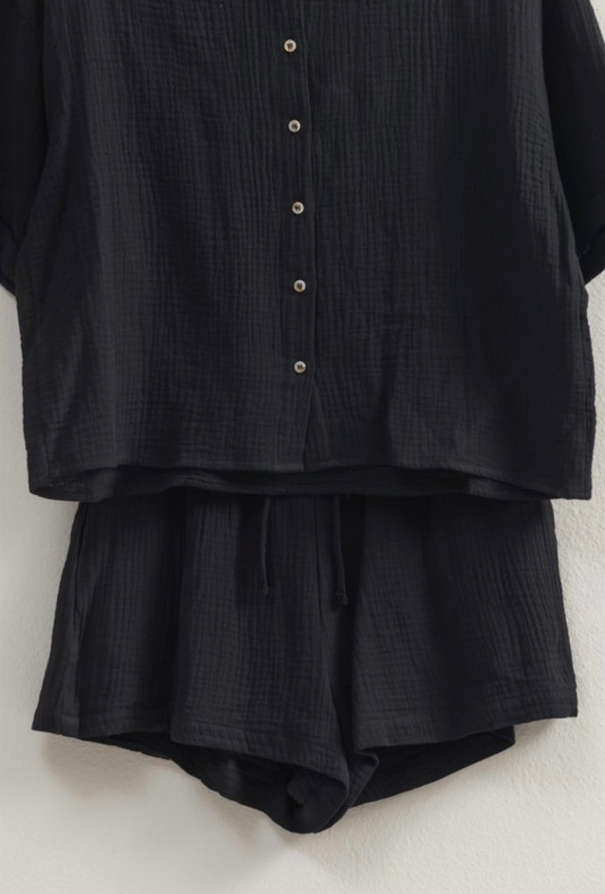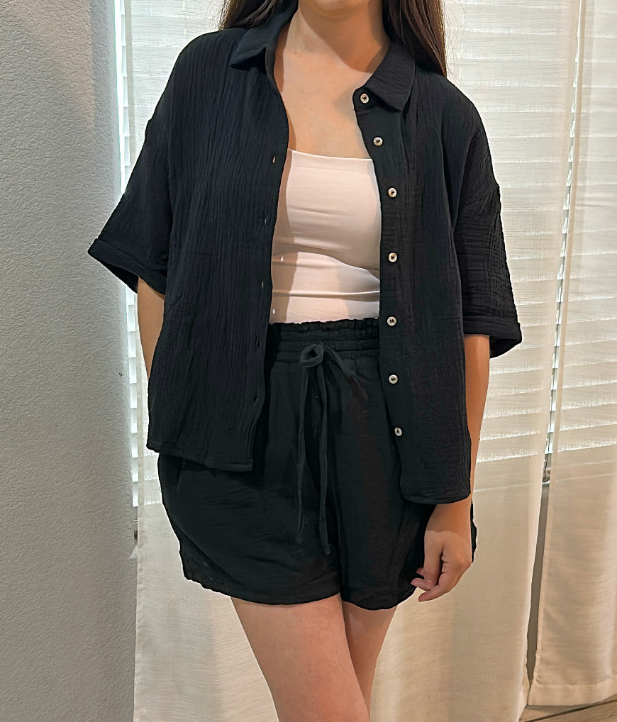 Get ready to obsess over this easy-to-style set! Made from double gauze fabric, the oversized shirt features short sleeves, a button-front design, and the comfy matching shorts have a drawstring waist and flowy short legs. 100% cotton. (No more "I have nothing to wear days")