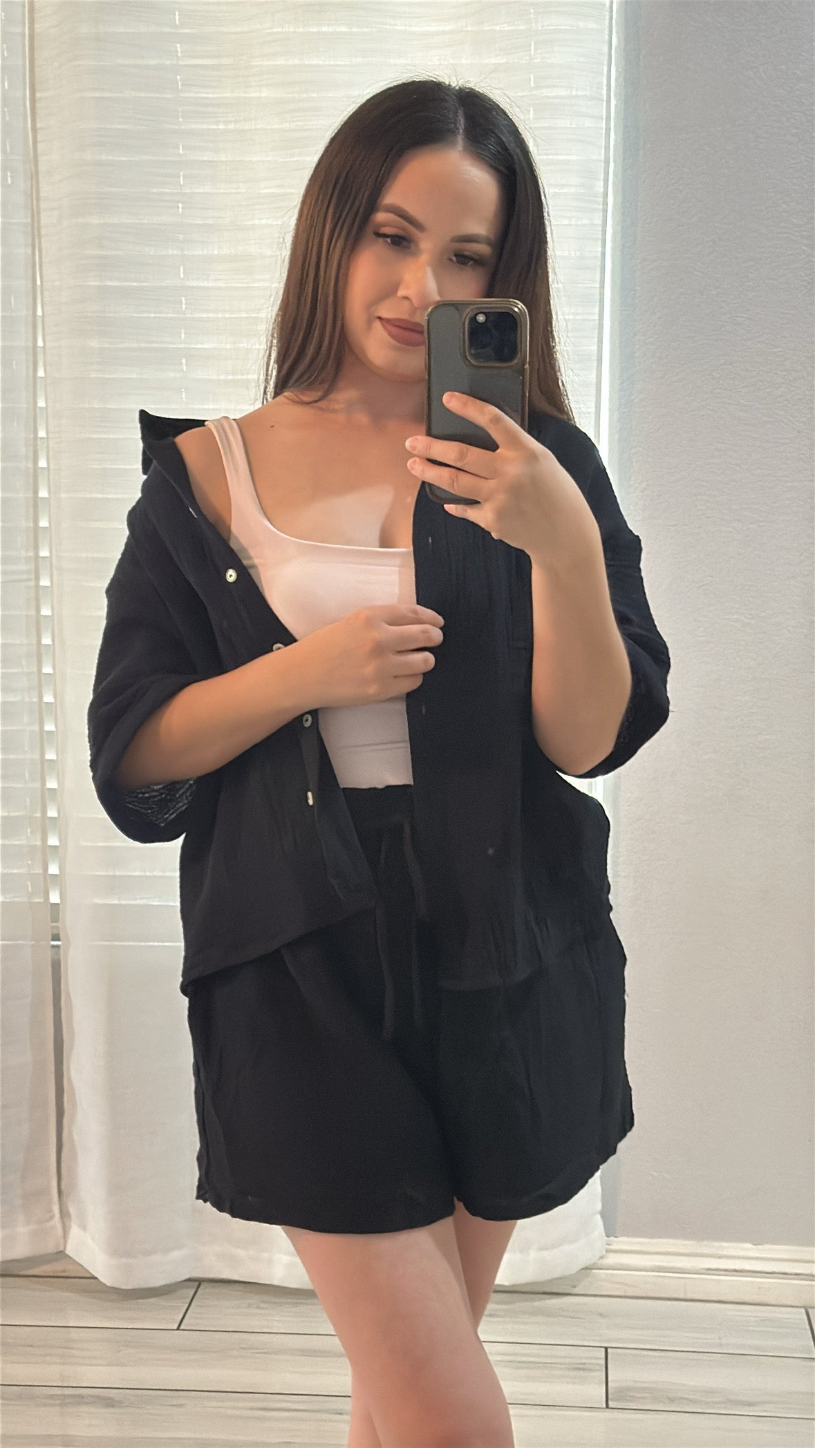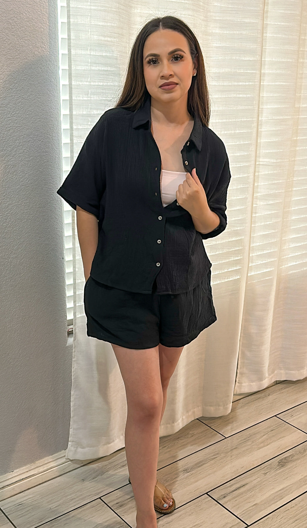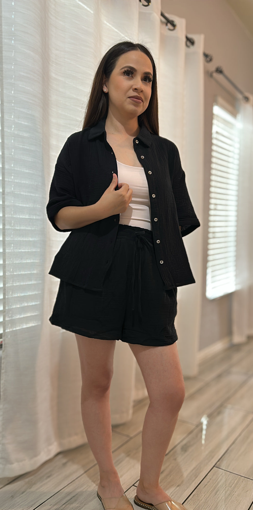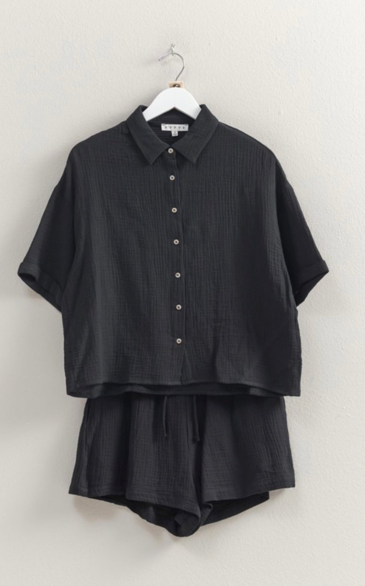 Get ready to obsess over this easy-to-style set! Made from double gauze fabric, the oversized shirt features short sleeves, a button-front design, and the comfy matching shorts have a drawstring waist and flowy short legs. 100% cotton. (No more "I have nothing to wear days")